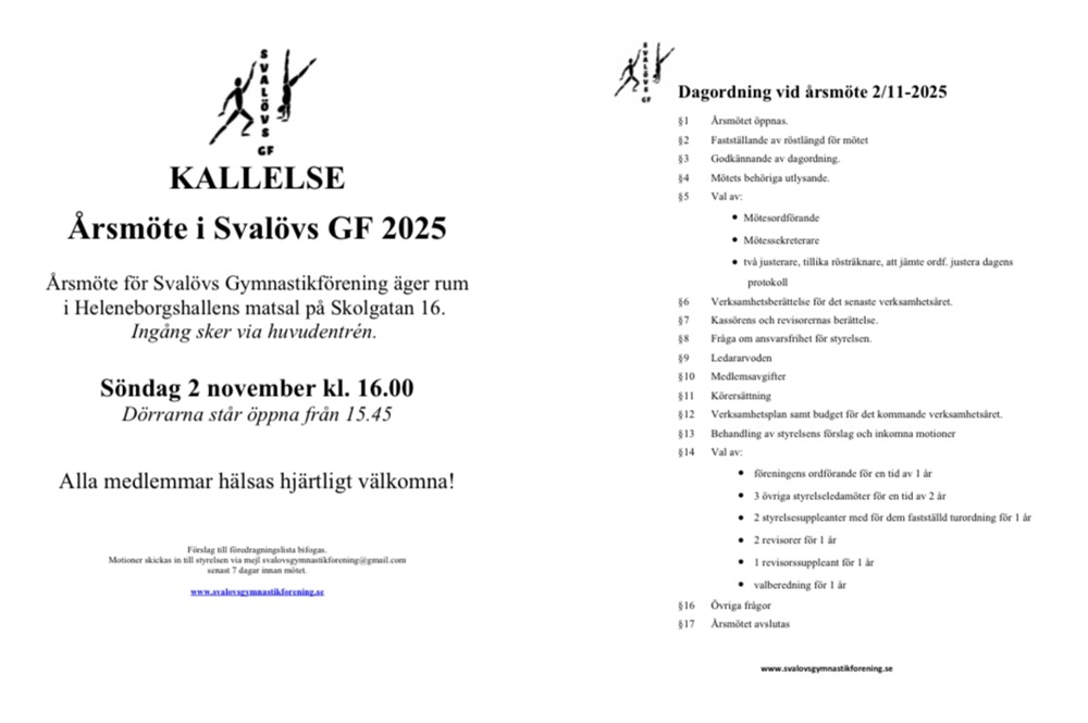 Anmälan ske genom anmälningsformuläret på vår hemsida (www.svalovsgymnastikforening.